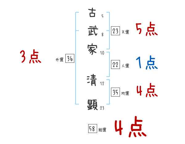 総運![]() | 古武家清顕さんの総運は58画の4つ星!安定した生活。大器晩成タイプ。 あなたの人生を表す1番重要な運勢です。生涯を通じて影響する総合運となり、主に50歳以降の晩年期に影響を及ぼします。 |