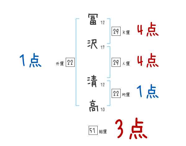 外運![]() | 冨沢清高さんの外運は22画の1つ星!努力することが苦手ないっぽう手先が器用。芸術性にも優れる。 生活面を象徴する運勢です。外部から受ける影響力を表し、結婚運、家庭運や職場、環境への順応性を表します。 |
