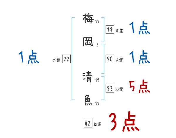 天運![]() | 梅岡清魚さんの天運は19画の1つ星!優れた才能を持ちますが、協調性が足りないことも。周りの人と協力する事を意識しましょう。 家系が持つ宿命的な運勢を表します。祖先から受け継いだ苗字ですので自分の力が及びません。家柄を象徴します。 |