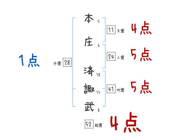 外運![]() | 本庄済諏武さんの外運は28画の1つ星!家庭環境に注意。スポーツで活躍できる能力があるかも。 生活面を象徴する運勢です。外部から受ける影響力を表し、結婚運、家庭運や職場、環境への順応性を表します。 |