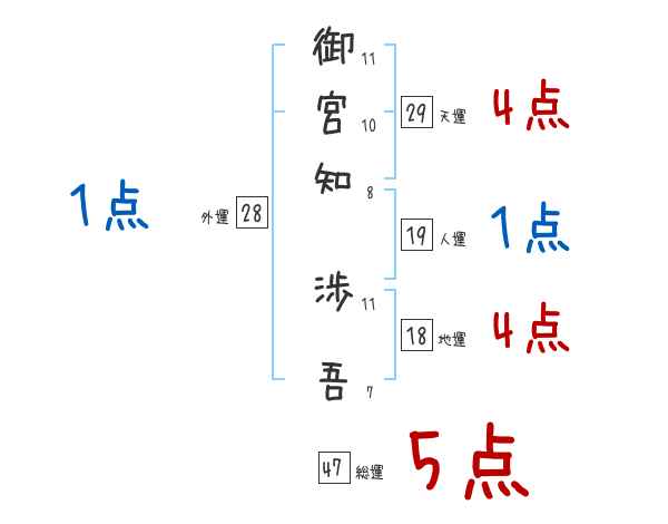 天運![]() | 御宮知渉吾さんの天運は29画の4つ星!完全主義で才能がある。厳格な心の持ち主。 家系が持つ宿命的な運勢を表します。祖先から受け継いだ苗字ですので自分の力が及びません。家柄を象徴します。 |