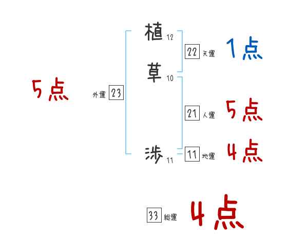 天運![]() | 植草渉さんの天運は22画の1つ星!努力することが苦手ないっぽう手先が器用。芸術性にも優れる。 家系が持つ宿命的な運勢を表します。祖先から受け継いだ苗字ですので自分の力が及びません。家柄を象徴します。 |