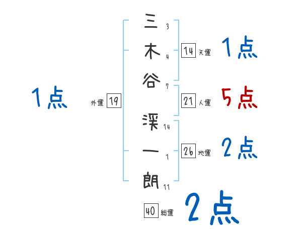 天運![]() | 三木谷渓一朗さんの天運は14画の1つ星!人に対して優しいがストレスを溜め込みがち。人間関係のトラブルを避けるよう気をつけましょう。 家系が持つ宿命的な運勢を表します。祖先から受け継いだ苗字ですので自分の力が及びません。家柄を象徴します。 |
