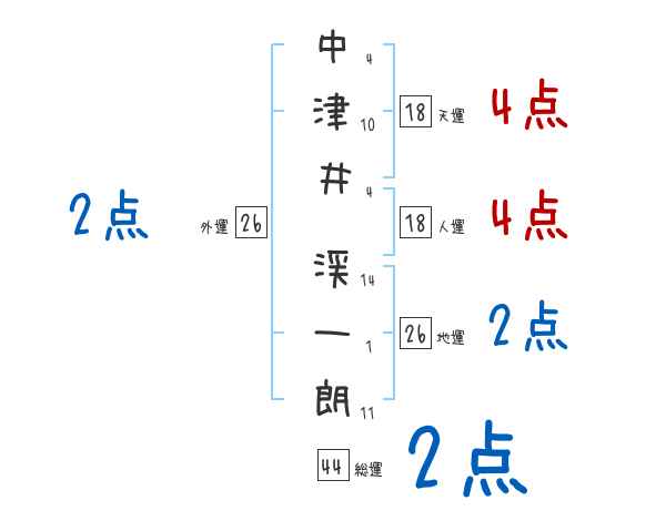 天運![]() | 中津井渓一朗さんの天運は18画の4つ星!情熱的で剛気。忍耐力があり信頼される。 家系が持つ宿命的な運勢を表します。祖先から受け継いだ苗字ですので自分の力が及びません。家柄を象徴します。 |