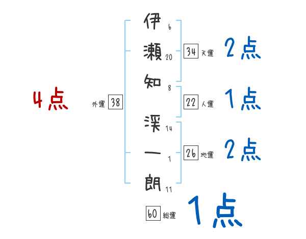 外運![]() | 伊瀬知渓一朗さんの外運は38画の4つ星!温厚な性格で技術的な才能を発揮する。職人的な仕事に向いている。 生活面を象徴する運勢です。外部から受ける影響力を表し、結婚運、家庭運や職場、環境への順応性を表します。 |