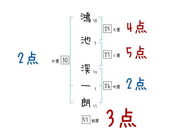 天運![]() | 鴻池渓一朗さんの天運は25画の4つ星!個性があり才能があふれる。強運の持ち主で発展する。 家系が持つ宿命的な運勢を表します。祖先から受け継いだ苗字ですので自分の力が及びません。家柄を象徴します。 |