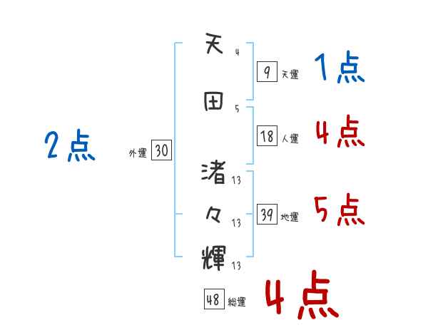 天運![]() | 天田渚々輝さんの天運は9画の1つ星!消極的で才能を発揮することが苦手なことも。周りの意見に耳を傾けましょう。 家系が持つ宿命的な運勢を表します。祖先から受け継いだ苗字ですので自分の力が及びません。家柄を象徴します。 |