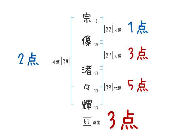 外運![]() | 宗像渚々輝さんの外運は34画の2つ星!独創性に優れるが、自尊心が強く災難に注意しましょう。 生活面を象徴する運勢です。外部から受ける影響力を表し、結婚運、家庭運や職場、環境への順応性を表します。 |