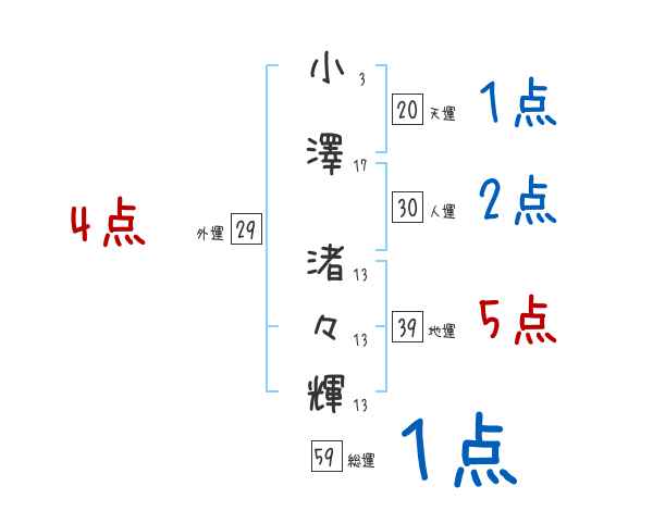 外運![]() | 小澤渚々輝さんの外運は29画の4つ星!完全主義で才能がある。厳格な心の持ち主。 生活面を象徴する運勢です。外部から受ける影響力を表し、結婚運、家庭運や職場、環境への順応性を表します。 |