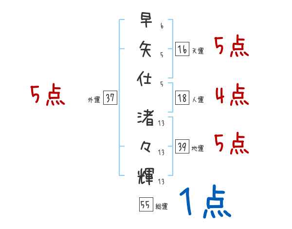 天運![]() | 早矢仕渚々輝さんの天運は16画の5つ星!人望が厚く大きく発展する。逆転成功が見える。 家系が持つ宿命的な運勢を表します。祖先から受け継いだ苗字ですので自分の力が及びません。家柄を象徴します。 |