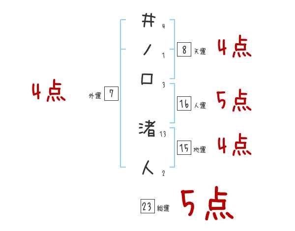 人運![]() | 井ノ口渚人さんの人運は16画の5つ星!人望が厚く大きく発展する。逆転成功が見える。 性格や才能などを表す2番目に重要な運勢です。人間関係や協調性、社会的な成功に影響します。主に20歳から50歳ぐらいまでの中年期の運勢を表します。 |