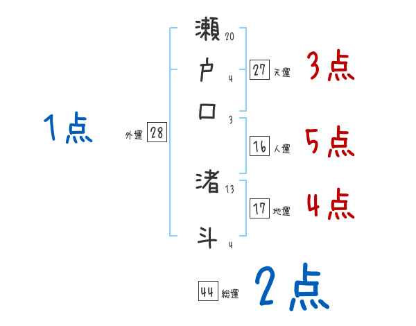 総運![]() | 瀬戸口渚斗さんの総運は44画の2つ星!誠実で慎重な性格。物事を考えすぎないように注意しましょう。 あなたの人生を表す1番重要な運勢です。生涯を通じて影響する総合運となり、主に50歳以降の晩年期に影響を及ぼします。 |