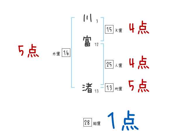 総運![]() | 川富渚さんの総運は28画の1つ星!家庭環境に注意。スポーツで活躍できる能力があるかも。 あなたの人生を表す1番重要な運勢です。生涯を通じて影響する総合運となり、主に50歳以降の晩年期に影響を及ぼします。 |