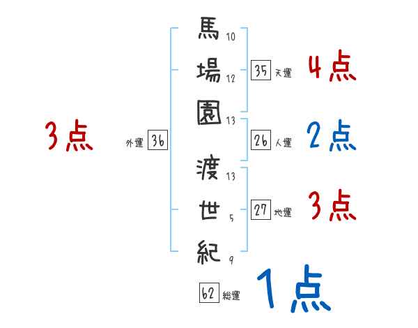 馬場園渡世紀さんの画数の鑑定結果