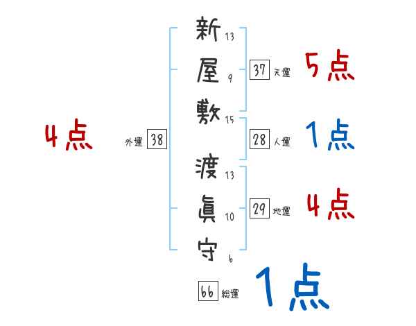 外運![]() | 新屋敷渡眞守さんの外運は38画の4つ星!温厚な性格で技術的な才能を発揮する。職人的な仕事に向いている。 生活面を象徴する運勢です。外部から受ける影響力を表し、結婚運、家庭運や職場、環境への順応性を表します。 |