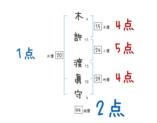 総運![]() | 木許渡眞守さんの総運は44画の2つ星!誠実で慎重な性格。物事を考えすぎないように注意しましょう。 あなたの人生を表す1番重要な運勢です。生涯を通じて影響する総合運となり、主に50歳以降の晩年期に影響を及ぼします。 |