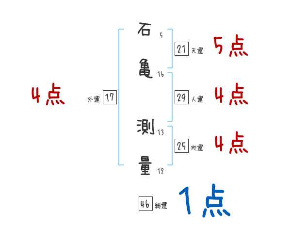 天運![]() | 石亀測量さんの天運は21画の5つ星!統率力がある。独立し成功する。名誉を手に入れる。 家系が持つ宿命的な運勢を表します。祖先から受け継いだ苗字ですので自分の力が及びません。家柄を象徴します。 |
