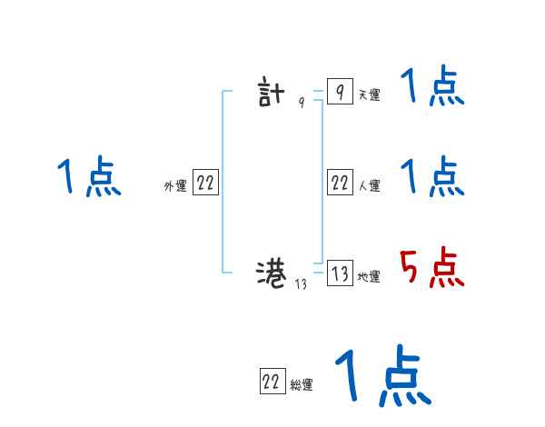 人運![]() | 計港さんの人運は22画の1つ星!努力することが苦手ないっぽう手先が器用。芸術性にも優れる。 性格や才能などを表す2番目に重要な運勢です。人間関係や協調性、社会的な成功に影響します。主に20歳から50歳ぐらいまでの中年期の運勢を表します。 |