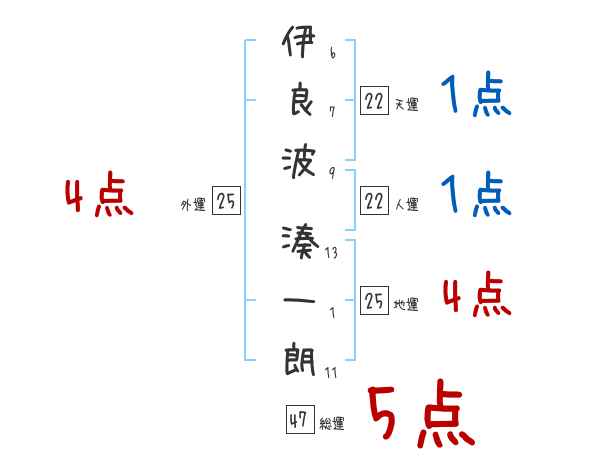 人運![]() | 伊良波湊一朗さんの人運は22画の1つ星!努力することが苦手ないっぽう手先が器用。芸術性にも優れる。 性格や才能などを表す2番目に重要な運勢です。人間関係や協調性、社会的な成功に影響します。主に20歳から50歳ぐらいまでの中年期の運勢を表します。 |