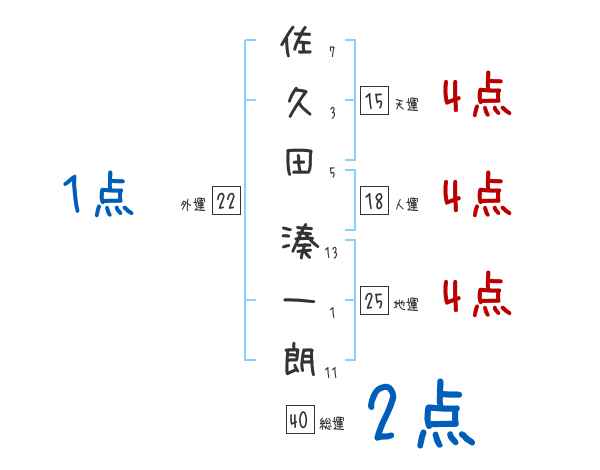 外運![]() | 佐久田湊一朗さんの外運は22画の1つ星!努力することが苦手ないっぽう手先が器用。芸術性にも優れる。 生活面を象徴する運勢です。外部から受ける影響力を表し、結婚運、家庭運や職場、環境への順応性を表します。 |