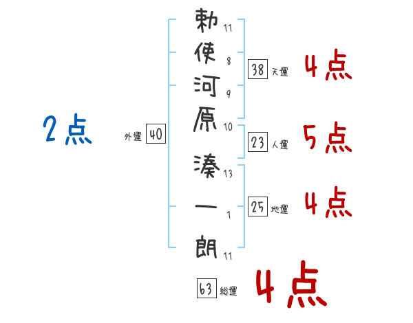 人運![]() | 勅使河原湊一朗さんの人運は23画の5つ星!想像力に優れ活力がある。一代で成功し名誉を手に入れる。 性格や才能などを表す2番目に重要な運勢です。人間関係や協調性、社会的な成功に影響します。主に20歳から50歳ぐらいまでの中年期の運勢を表します。 |