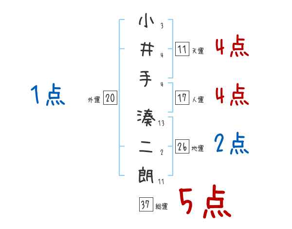 天運![]() | 小井手湊二朗さんの天運は11画の4つ星!着実に富や地位を得る幸運な人生。 家系が持つ宿命的な運勢を表します。祖先から受け継いだ苗字ですので自分の力が及びません。家柄を象徴します。 |
