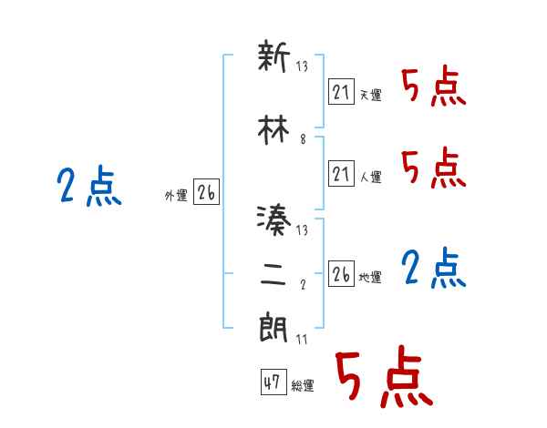 総運![]() | 新林湊二朗さんの総運は47画の5つ星!実力が開花し発展する円満な人生。財に恵まれる。 あなたの人生を表す1番重要な運勢です。生涯を通じて影響する総合運となり、主に50歳以降の晩年期に影響を及ぼします。 |