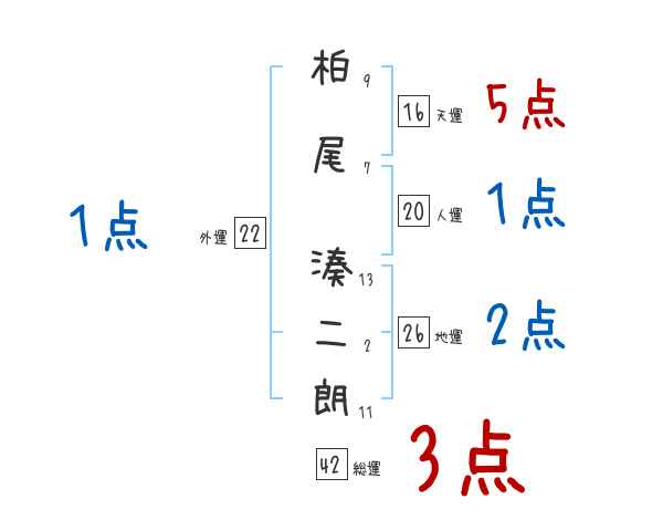 外運![]() | 柏尾湊二朗さんの外運は22画の1つ星!努力することが苦手ないっぽう手先が器用。芸術性にも優れる。 生活面を象徴する運勢です。外部から受ける影響力を表し、結婚運、家庭運や職場、環境への順応性を表します。 |
