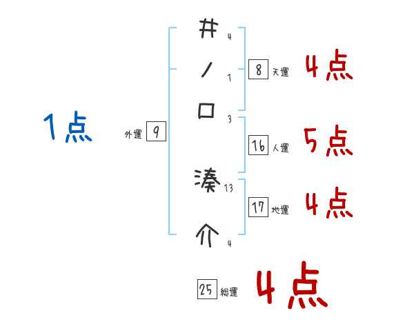 人運![]() | 井ノ口湊介さんの人運は16画の5つ星!人望が厚く大きく発展する。逆転成功が見える。 性格や才能などを表す2番目に重要な運勢です。人間関係や協調性、社会的な成功に影響します。主に20歳から50歳ぐらいまでの中年期の運勢を表します。 |