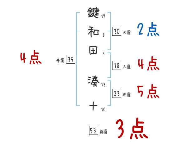 天運![]() | 鍵和田湊十さんの天運は30画の2つ星!浮き沈みの激しさに注意しましょう。 家系が持つ宿命的な運勢を表します。祖先から受け継いだ苗字ですので自分の力が及びません。家柄を象徴します。 |