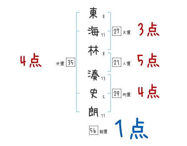 人運![]() | 東海林湊史朗さんの人運は21画の5つ星!統率力がある。独立し成功する。名誉を手に入れる。 性格や才能などを表す2番目に重要な運勢です。人間関係や協調性、社会的な成功に影響します。主に20歳から50歳ぐらいまでの中年期の運勢を表します。 |