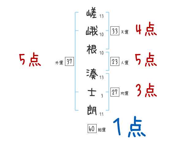 外運![]() | 嵯峨根湊士朗さんの外運は37画の5つ星!努力家で順応性に優れる。現実的な考え方ができ忠実に物事をこなす。 生活面を象徴する運勢です。外部から受ける影響力を表し、結婚運、家庭運や職場、環境への順応性を表します。 |