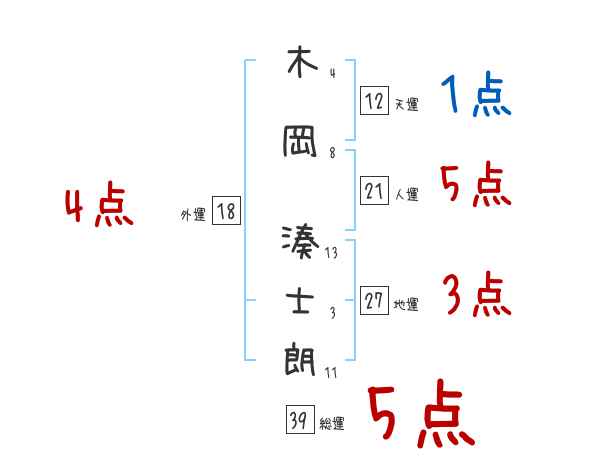 人運![]() | 木岡湊士朗さんの人運は21画の5つ星!統率力がある。独立し成功する。名誉を手に入れる。 性格や才能などを表す2番目に重要な運勢です。人間関係や協調性、社会的な成功に影響します。主に20歳から50歳ぐらいまでの中年期の運勢を表します。 |