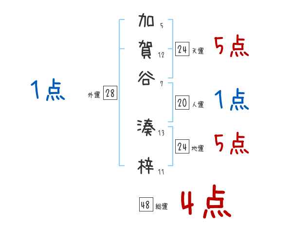 天運![]() | 加賀谷湊梓さんの天運は24画の5つ星!家庭運が良く順調な人生。金運にも恵まれる。 家系が持つ宿命的な運勢を表します。祖先から受け継いだ苗字ですので自分の力が及びません。家柄を象徴します。 |
