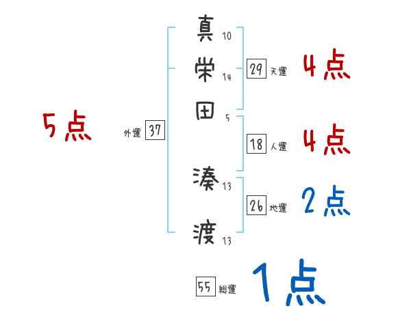 総運![]() | 真栄田湊渡さんの総運は55画の1つ星!欲張りな性格で軽率な行動に注意しましょう。病気に気をつけて。 あなたの人生を表す1番重要な運勢です。生涯を通じて影響する総合運となり、主に50歳以降の晩年期に影響を及ぼします。 |