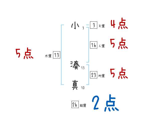 人運![]() | 小湊真さんの人運は16画の5つ星!人望が厚く大きく発展する。逆転成功が見える。 性格や才能などを表す2番目に重要な運勢です。人間関係や協調性、社会的な成功に影響します。主に20歳から50歳ぐらいまでの中年期の運勢を表します。 |