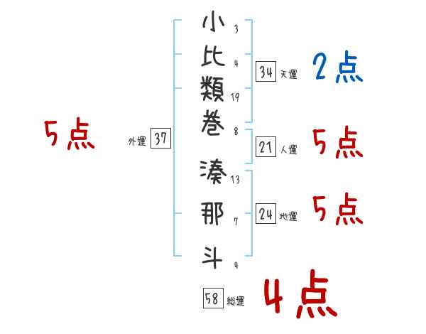 外運![]() | 小比類巻湊那斗さんの外運は37画の5つ星!努力家で順応性に優れる。現実的な考え方ができ忠実に物事をこなす。 生活面を象徴する運勢です。外部から受ける影響力を表し、結婚運、家庭運や職場、環境への順応性を表します。 |