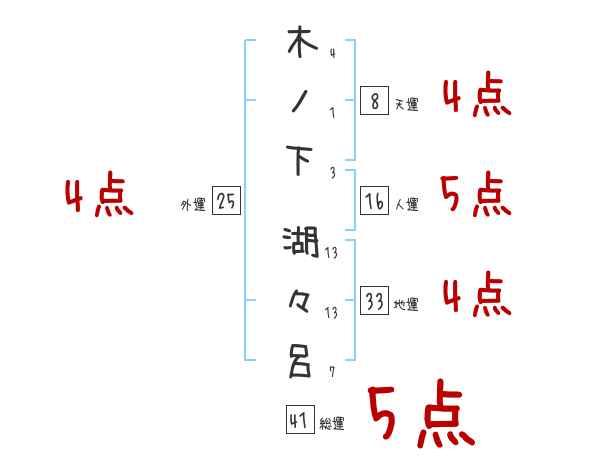 天運![]() | 木ノ下湖々呂さんの天運は8画の4つ星!勤勉家。根気強く努力し成功する。忍耐力がある。 家系が持つ宿命的な運勢を表します。祖先から受け継いだ苗字ですので自分の力が及びません。家柄を象徴します。 |