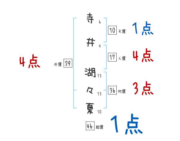 外運![]() | 寺井湖々夏さんの外運は29画の4つ星!完全主義で才能がある。厳格な心の持ち主。 生活面を象徴する運勢です。外部から受ける影響力を表し、結婚運、家庭運や職場、環境への順応性を表します。 |