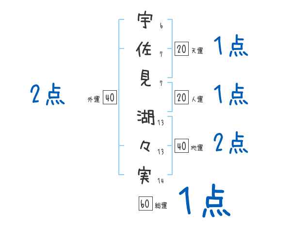 外運![]() | 宇佐見湖々実さんの外運は40画の2つ星!自信過剰で物事に固執するためトラブルに注意。 生活面を象徴する運勢です。外部から受ける影響力を表し、結婚運、家庭運や職場、環境への順応性を表します。 |