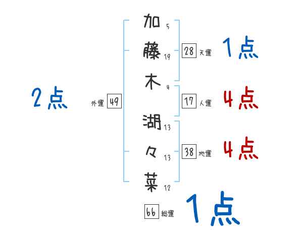 総運![]() | 加藤木湖々菜さんの総運は66画の1つ星!迷うことが多く挫折しやすい傾向が。辛抱強く物事に取り組みましょう。 あなたの人生を表す1番重要な運勢です。生涯を通じて影響する総合運となり、主に50歳以降の晩年期に影響を及ぼします。 |