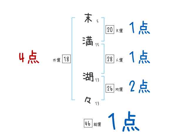 人運![]() | 末満湖々さんの人運は28画の1つ星!家庭環境に注意。スポーツで活躍できる能力があるかも。 性格や才能などを表す2番目に重要な運勢です。人間関係や協調性、社会的な成功に影響します。主に20歳から50歳ぐらいまでの中年期の運勢を表します。 |