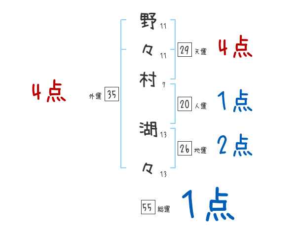 外運![]() | 野々村湖々さんの外運は35画の4つ星!温厚な性格で感受性が高い。穏和な性格で人望が厚い。 生活面を象徴する運勢です。外部から受ける影響力を表し、結婚運、家庭運や職場、環境への順応性を表します。 |