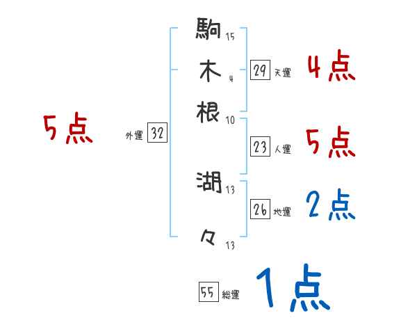 外運![]() | 駒木根湖々さんの外運は32画の5つ星!柔軟性があり成功する。チャンスが多く金運が良い。 生活面を象徴する運勢です。外部から受ける影響力を表し、結婚運、家庭運や職場、環境への順応性を表します。 |