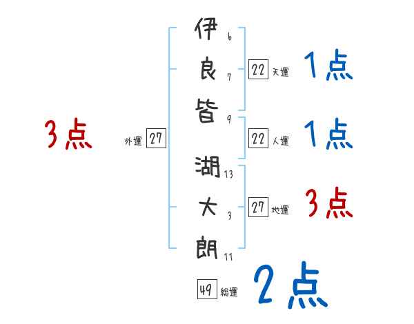 人運![]() | 伊良皆湖大朗さんの人運は22画の1つ星!努力することが苦手ないっぽう手先が器用。芸術性にも優れる。 性格や才能などを表す2番目に重要な運勢です。人間関係や協調性、社会的な成功に影響します。主に20歳から50歳ぐらいまでの中年期の運勢を表します。 |