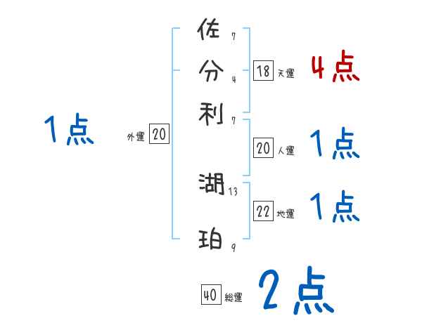 天運![]() | 佐分利湖珀さんの天運は18画の4つ星!情熱的で剛気。忍耐力があり信頼される。 家系が持つ宿命的な運勢を表します。祖先から受け継いだ苗字ですので自分の力が及びません。家柄を象徴します。 |