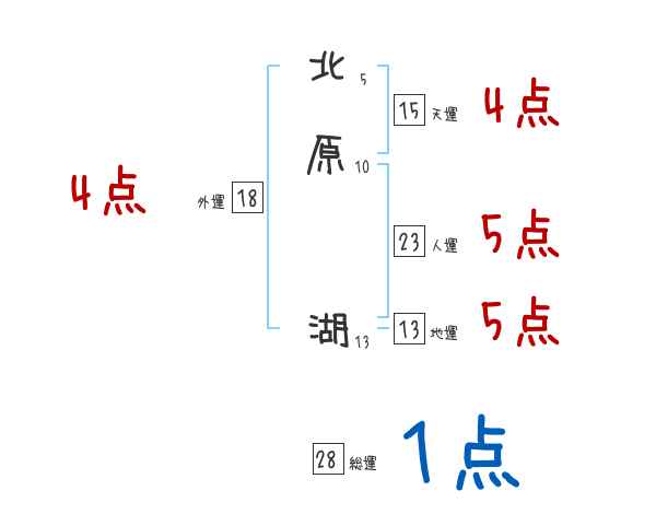 総運![]() | 北原湖さんの総運は28画の1つ星!家庭環境に注意。スポーツで活躍できる能力があるかも。 あなたの人生を表す1番重要な運勢です。生涯を通じて影響する総合運となり、主に50歳以降の晩年期に影響を及ぼします。 |