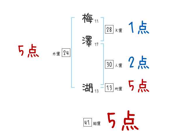 地運![]() | 梅澤湖さんの地運は13画の5つ星!才能に恵まれ人気がある。名声を手に入れる。円満な人生。 個性を表す基礎的な運勢です。性格形成や対人関係、行動力など家庭環境に影響されます。主に誕生してから20歳くらいまでの若年期の運勢を表します。 |