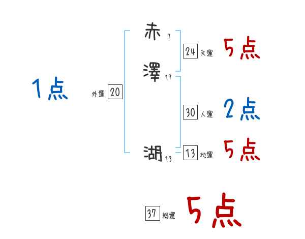 総運![]() | 赤澤湖さんの総運は37画の5つ星!努力家で順応性に優れる。現実的な考え方ができ忠実に物事をこなす。 あなたの人生を表す1番重要な運勢です。生涯を通じて影響する総合運となり、主に50歳以降の晩年期に影響を及ぼします。 |