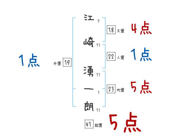 天運![]() | 江崎湧一朗さんの天運は18画の4つ星!情熱的で剛気。忍耐力があり信頼される。 家系が持つ宿命的な運勢を表します。祖先から受け継いだ苗字ですので自分の力が及びません。家柄を象徴します。 |